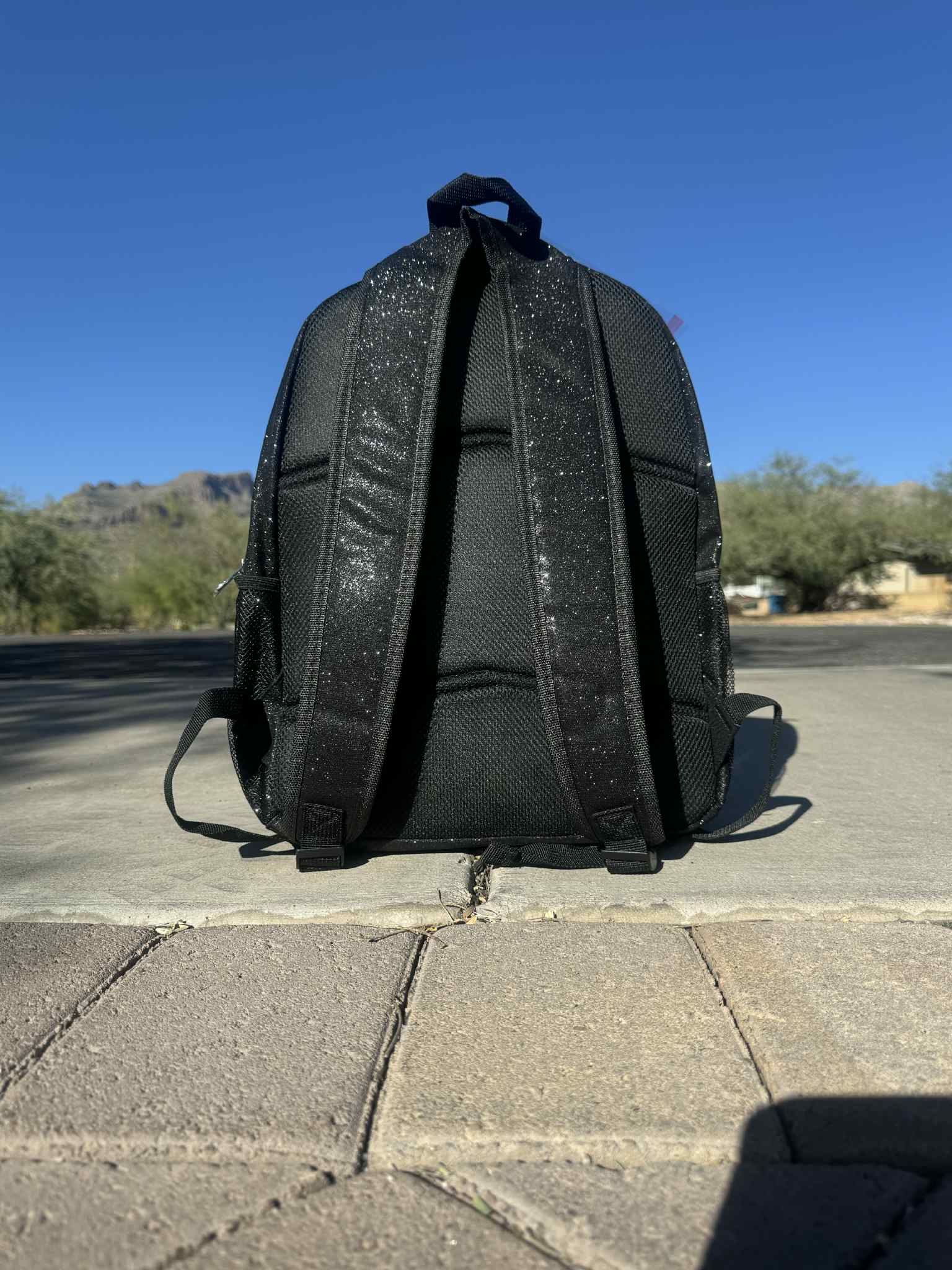 Shine bright from practice to performance with this stylish glitter backpack—made for cheerleaders, dancers, and gymnasts always on the move. Whether you're heading to a competition, rehearsal, or team event, this bag keeps your essentials organized and your style on point. Crafted with glitter-covered fabric, it's both eye-catching and durable—ideal for travel and daily use. The main compartment is fully lined and zips closed to keep uniforms, warmups, and personal items safe. The front zip pocket is also fully lined and includes inner open and cell phone pockets for quick access to small must-haves. Two side mesh pockets are perfect for water bottles, snacks, or gear, while adjustable shoulder straps ensure comfortable carrying all day long. This is the perfect bag for athletes who want to sparkle while they hustle.